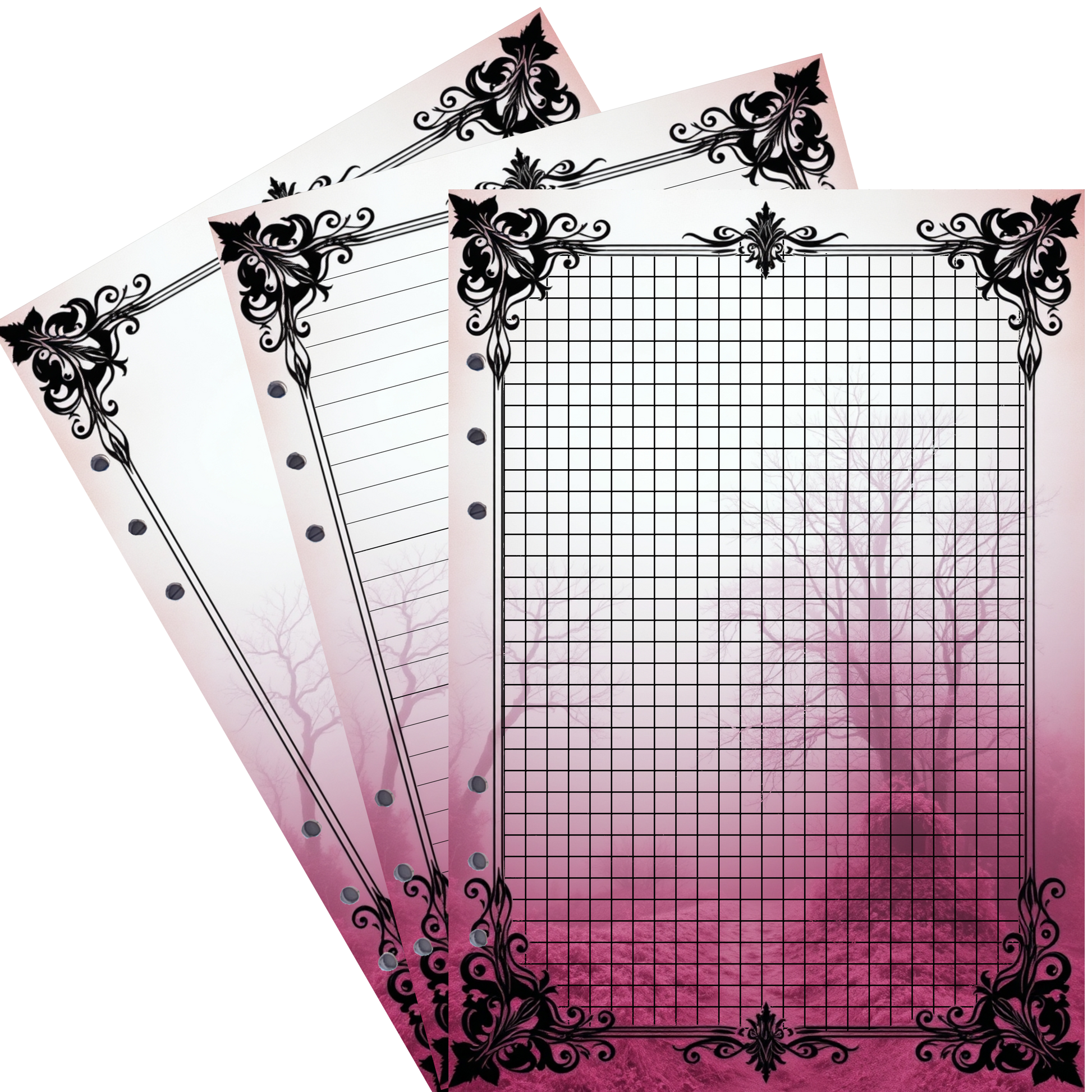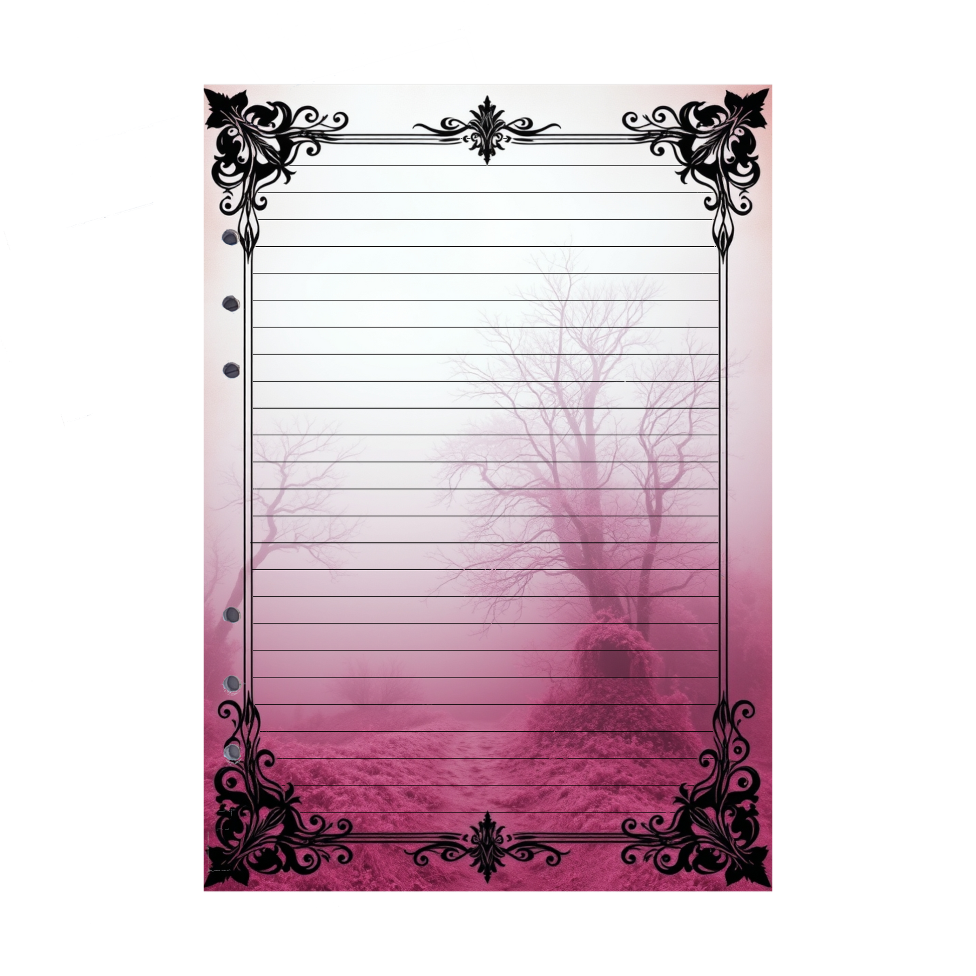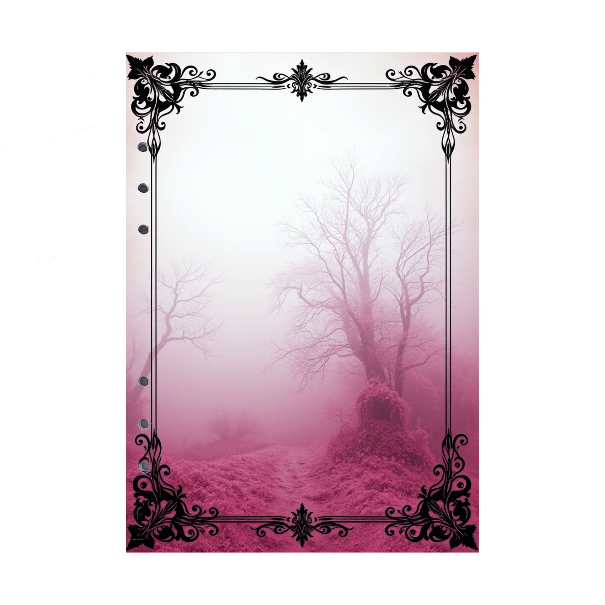 Erleben Sie die Magie eines geheimnisvollen Waldes mit den Mystic Fog 95-Ringbucheinlagen im DIN A5-Format. Der schmal bewachsene Weg durch unberührten Wald erscheint in sanftem Pink und wird von einem dichten, rosa Nebel umhüllt, der eine mystische Atmosphäre schafft. Lassen Sie sich von dieser einzigartigen Szenerie inspirieren, während Sie Ihre Gedanken und Ideen festhalten.
