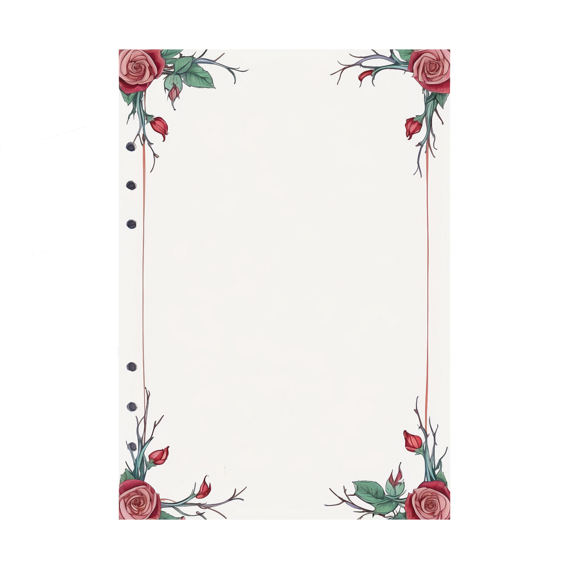 Erleben Sie die Schönheit der Natur mit unseren DIN A5 Nachfüllseiten im charmanten "Rose 10"-Design. An allen vier Ecken befindet sich eine Rosenblüte mit Knospen in einem rosa-roten Ton, die Ihren Notizen eine lebendige und inspirierende Note verleihen.