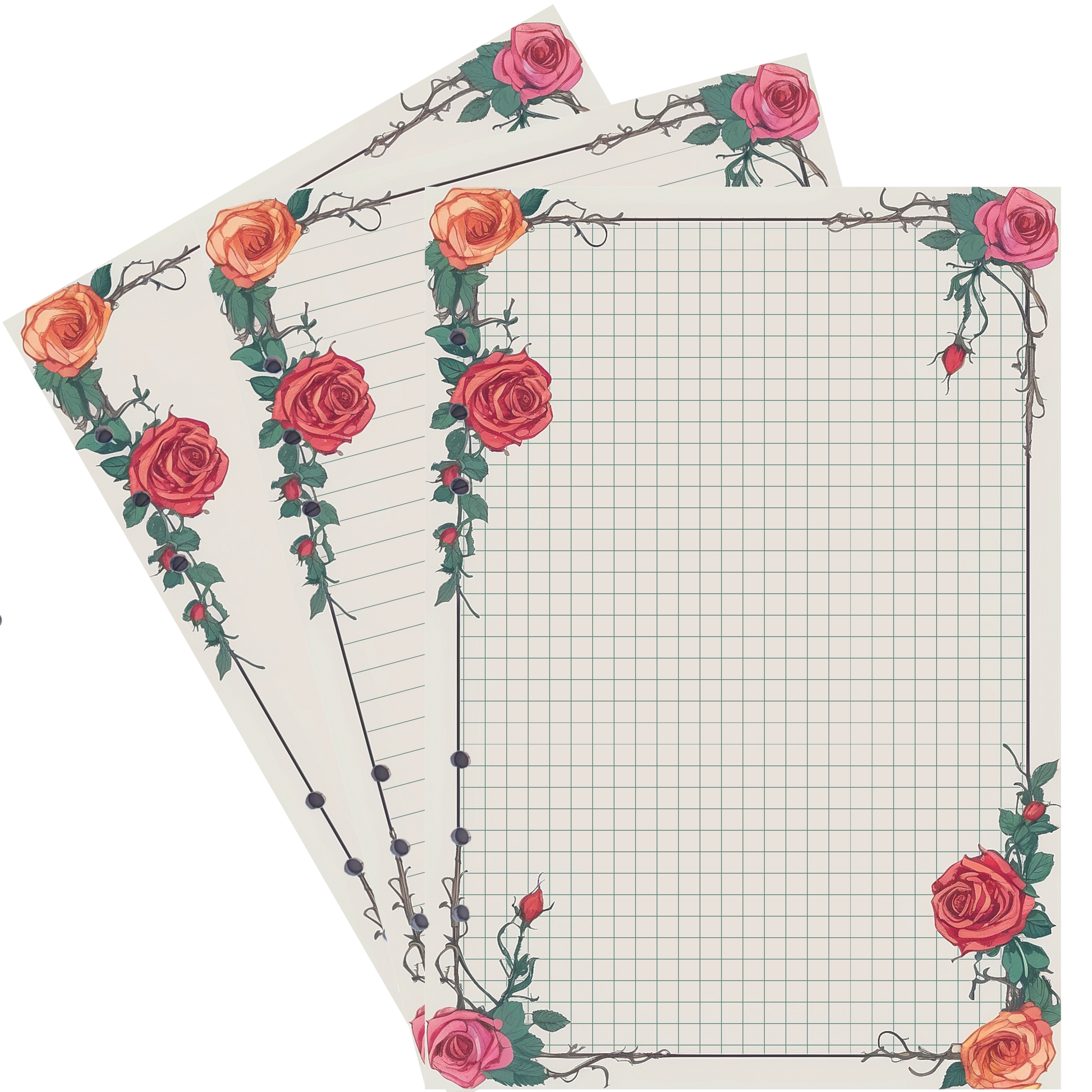 Erleben Sie ein farbenfrohes Blütenmeer mit unseren DIN A5 Nachfüllseiten im "Rose 21"-Design. Rosenranken und Blüten in warmen Orange-, Rosa- und Rottönen schmücken Ihre Seiten und inspirieren zu neuen Ideen und Kreativität.