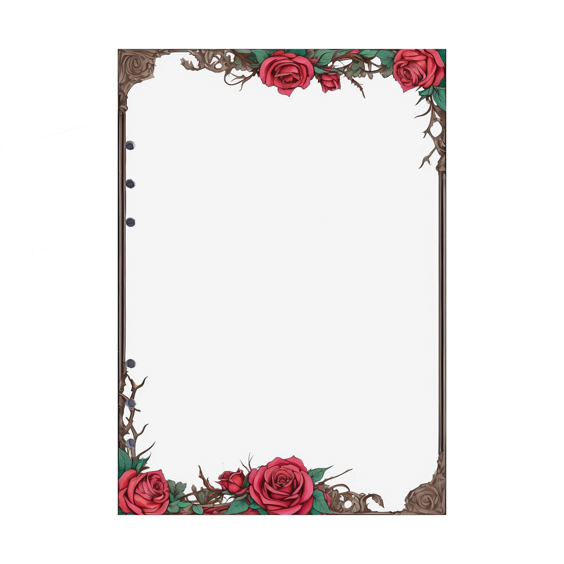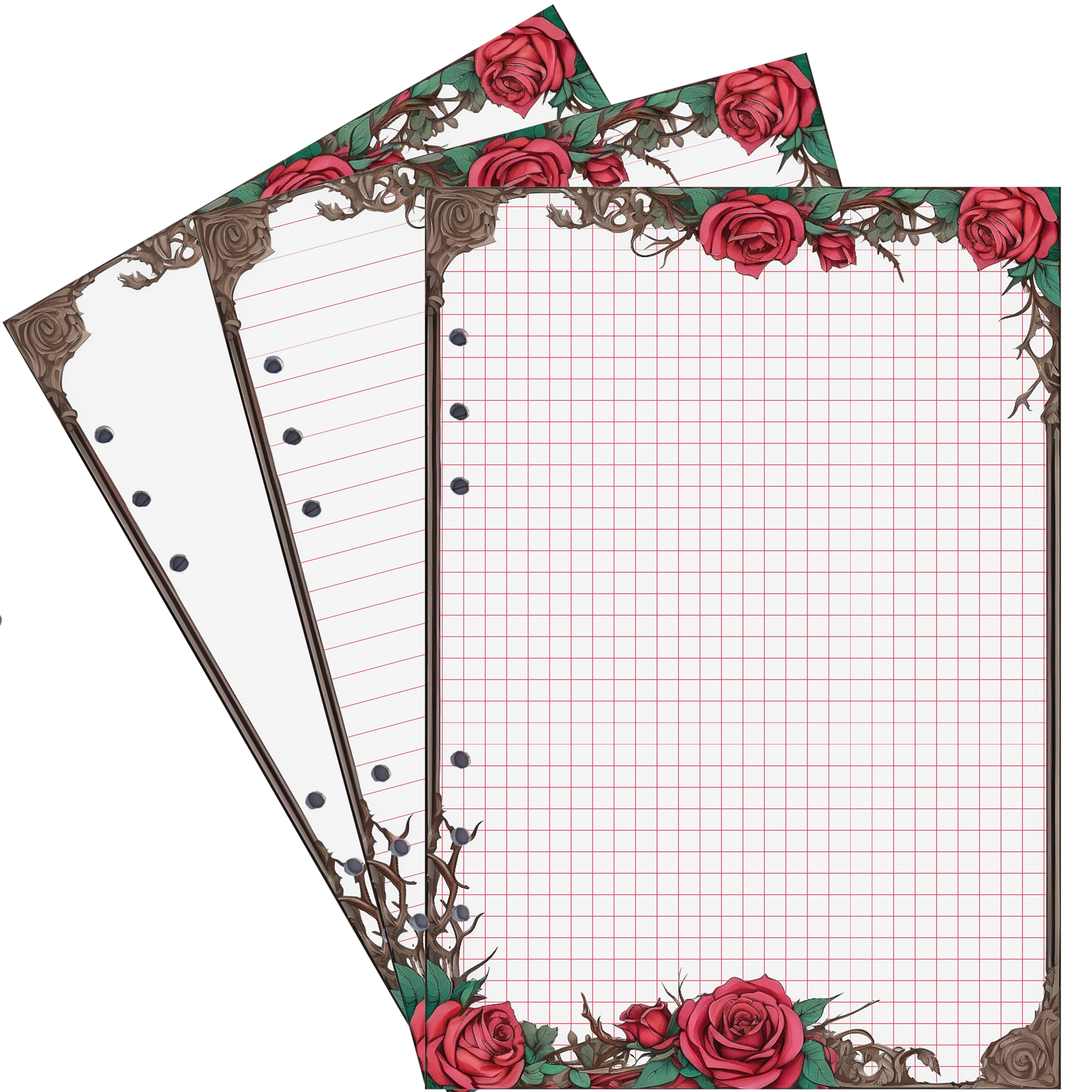 Verleihen Sie Ihren Notizen eine edle Note mit unseren DIN A5 Nachfüllseiten im "Rose 23"-Design. Ein metallischer, brauner Rand und eine blühende Rosenranke in Rot an zwei gegenüberliegenden Ecken sorgen für eine luxuriöse und einzigartige Optik.