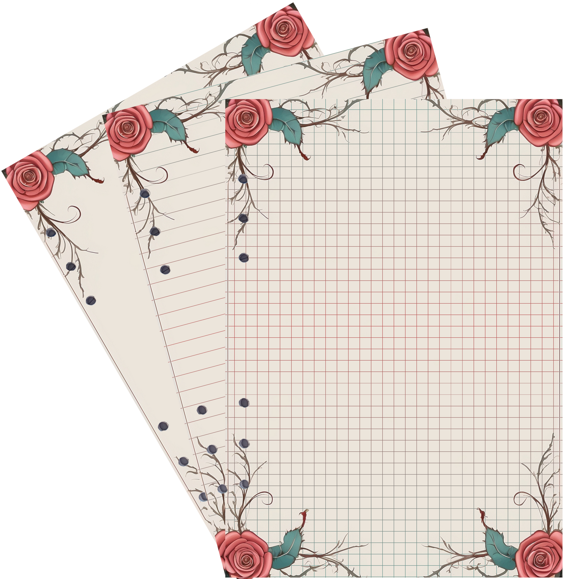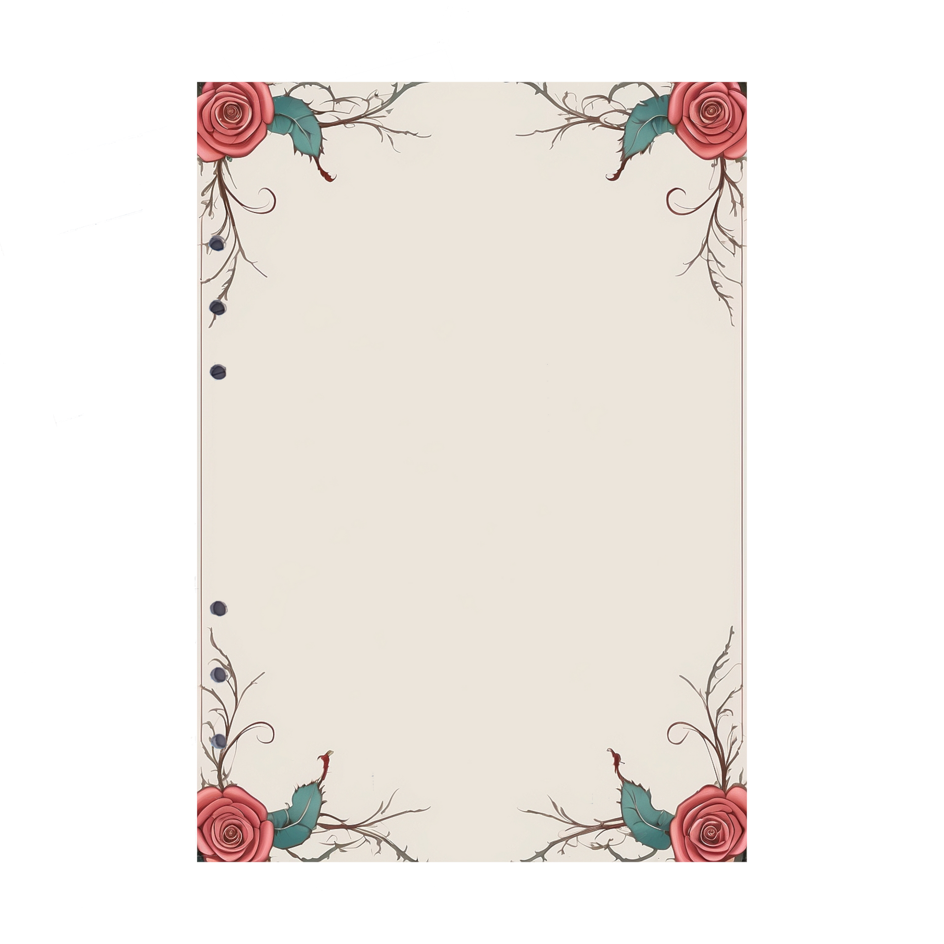 Erleben Sie die Eleganz der Natur mit unseren DIN A5 Nachfüllseiten im stilvollen "Rose 5"-Design. Rote Rosen, die jede Ecke zieren und mit Zweigen verziert sind, verleihen Ihren Notizen eine klassische und zeitlose Schönheit.