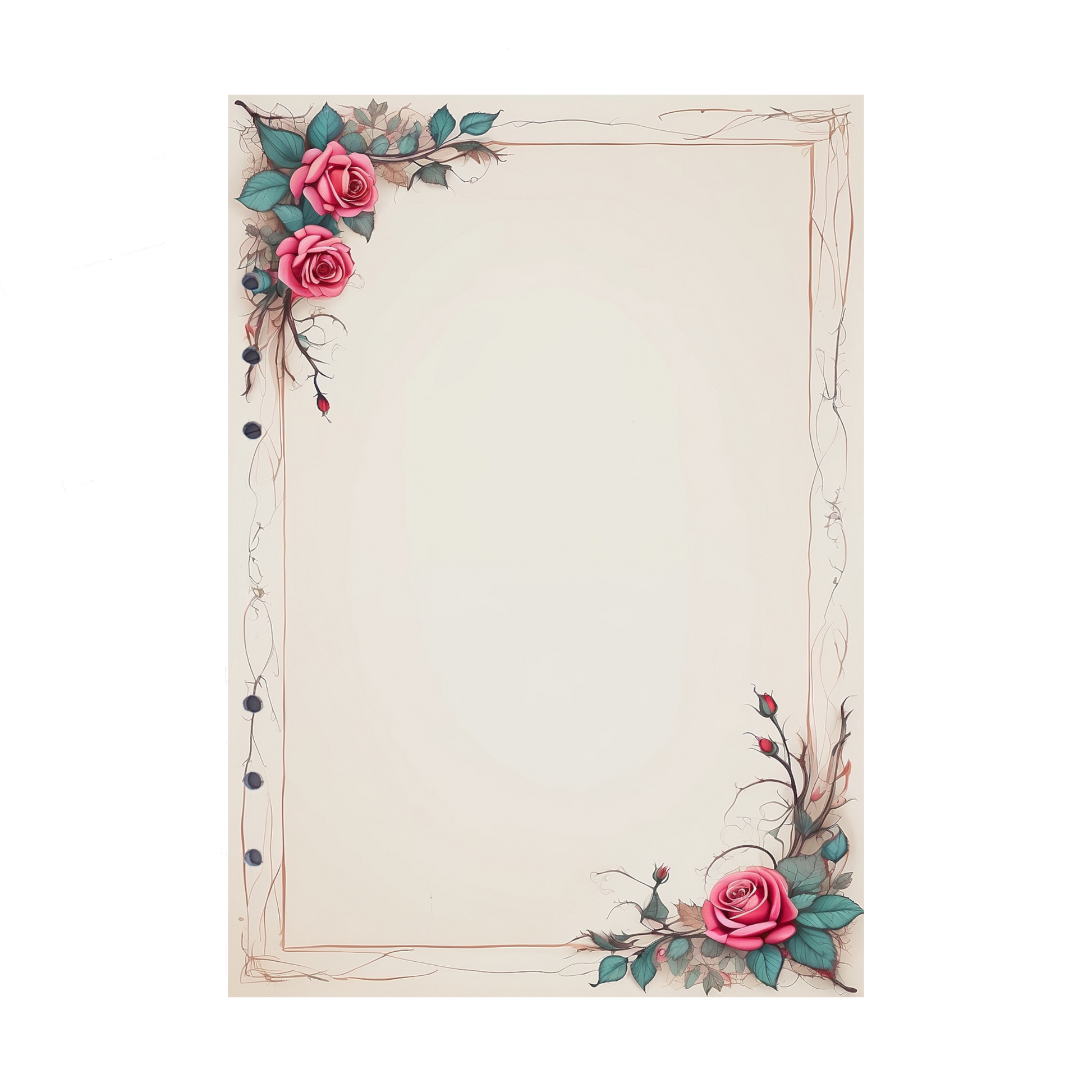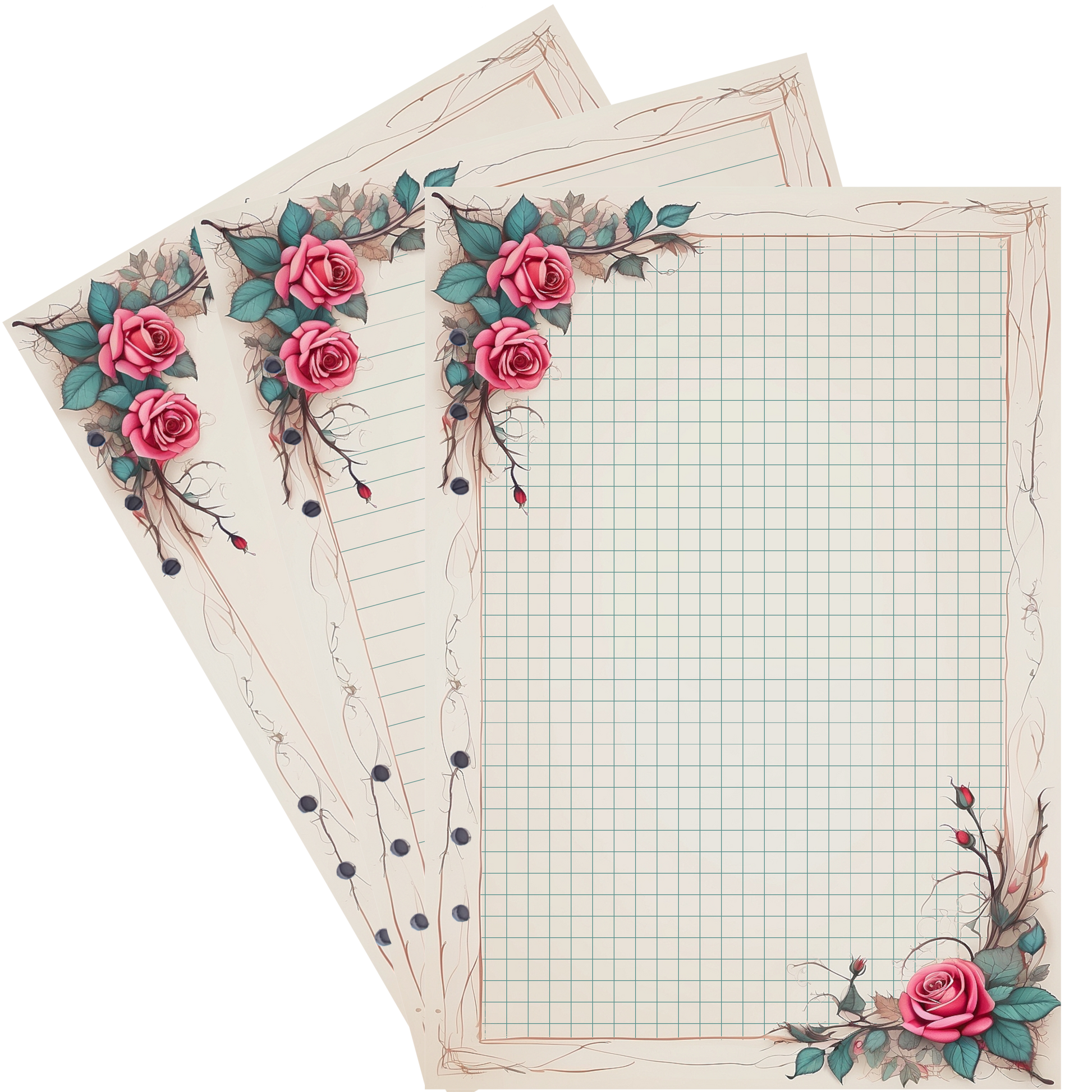 Bringen Sie eine lebendige Eleganz in Ihre Notizen mit unseren DIN A5 Nachfüllseiten im charmanten "Rose 7"-Design. Dunkelrosa Rosen in zwei gegenüberliegenden Ecken, begleitet von petrolfarbenem Laub, sorgen für eine stilvolle und inspirierende Atmosphäre.