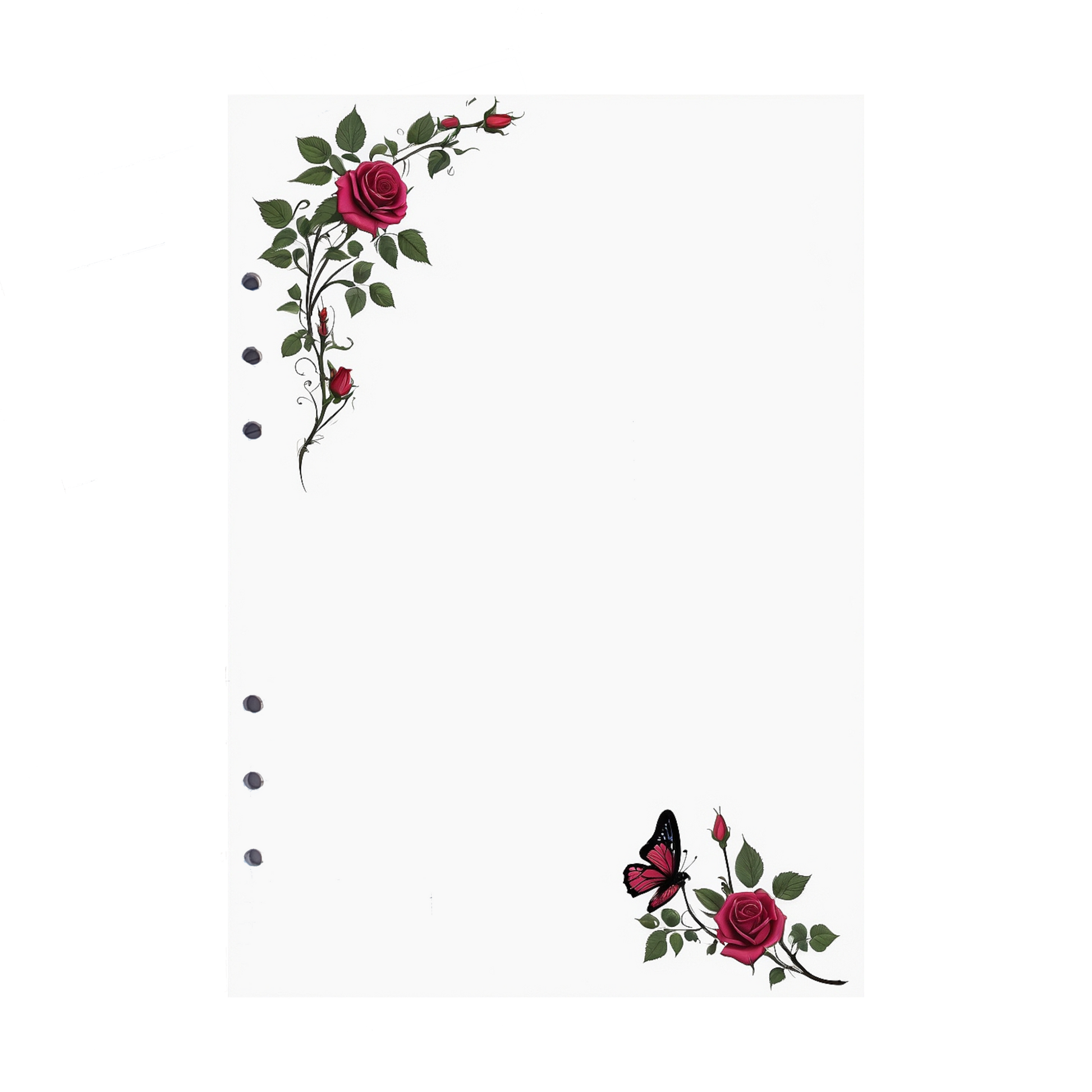 Erwecken Sie Ihre Kreativität mit unseren DIN A5 Nachfüllseiten im eleganten "Rose 8"-Design. Zwei schwungvolle Rosenranken, die sich auf randlosem Papier in die Lineatur einschmiegen, machen Ihre Notizen zu einem ästhetischen Highlight.