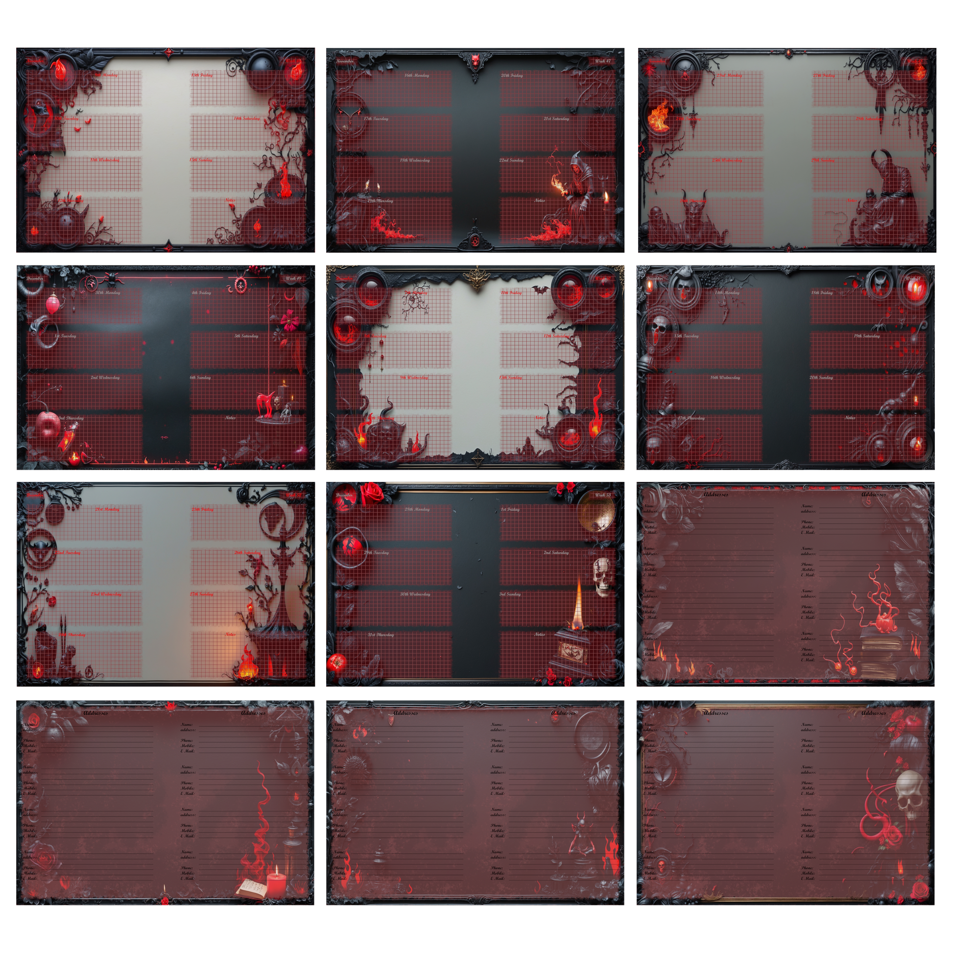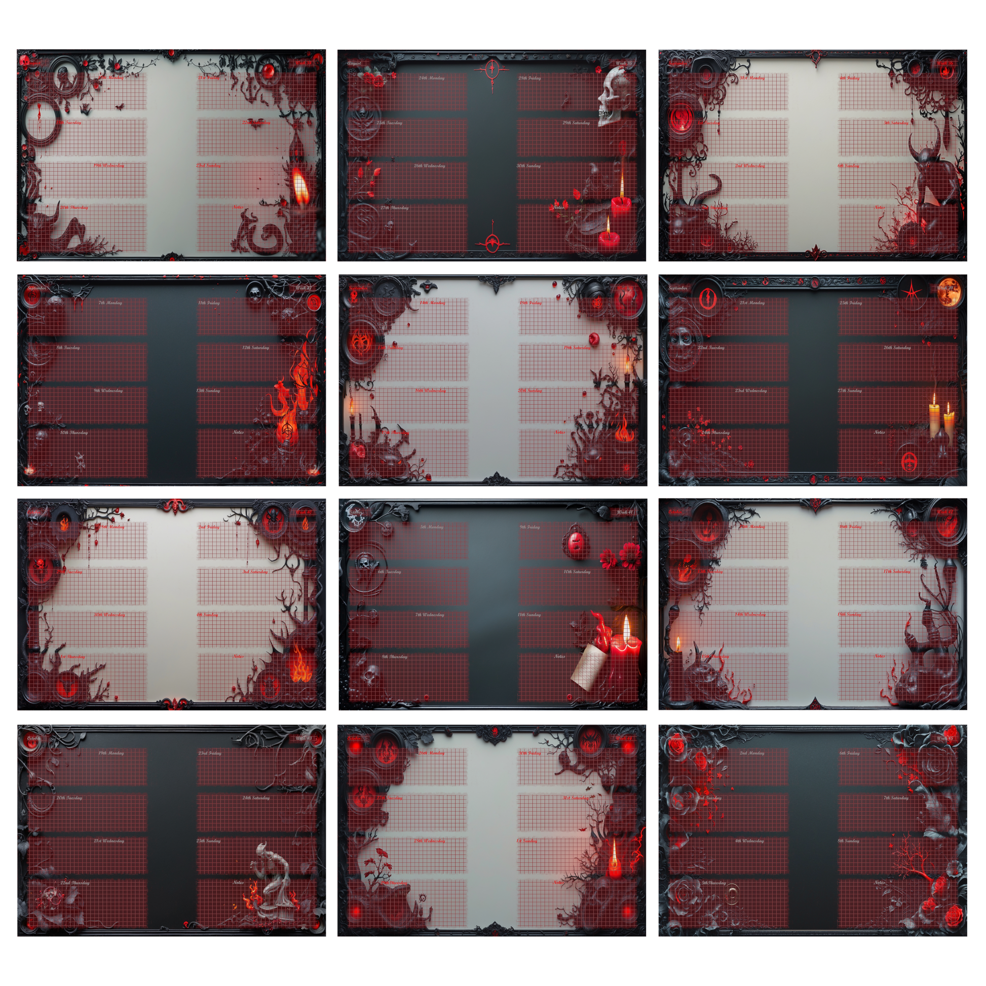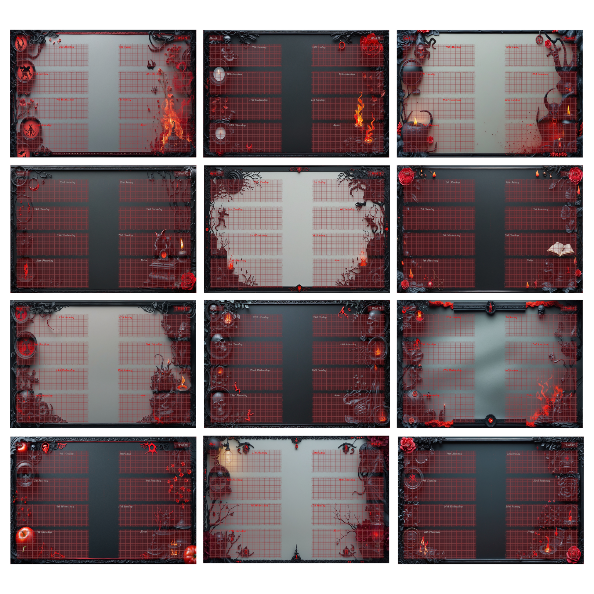 Die schwarz-roten Motive – ein Spiel aus Asche, Rosen und mystischen Ornamenten – machen den „Ashes & Roses“ Kalender zu einem echten Eyecatcher. Ideal für alle, die einen ästhetisch düsteren Stil lieben.