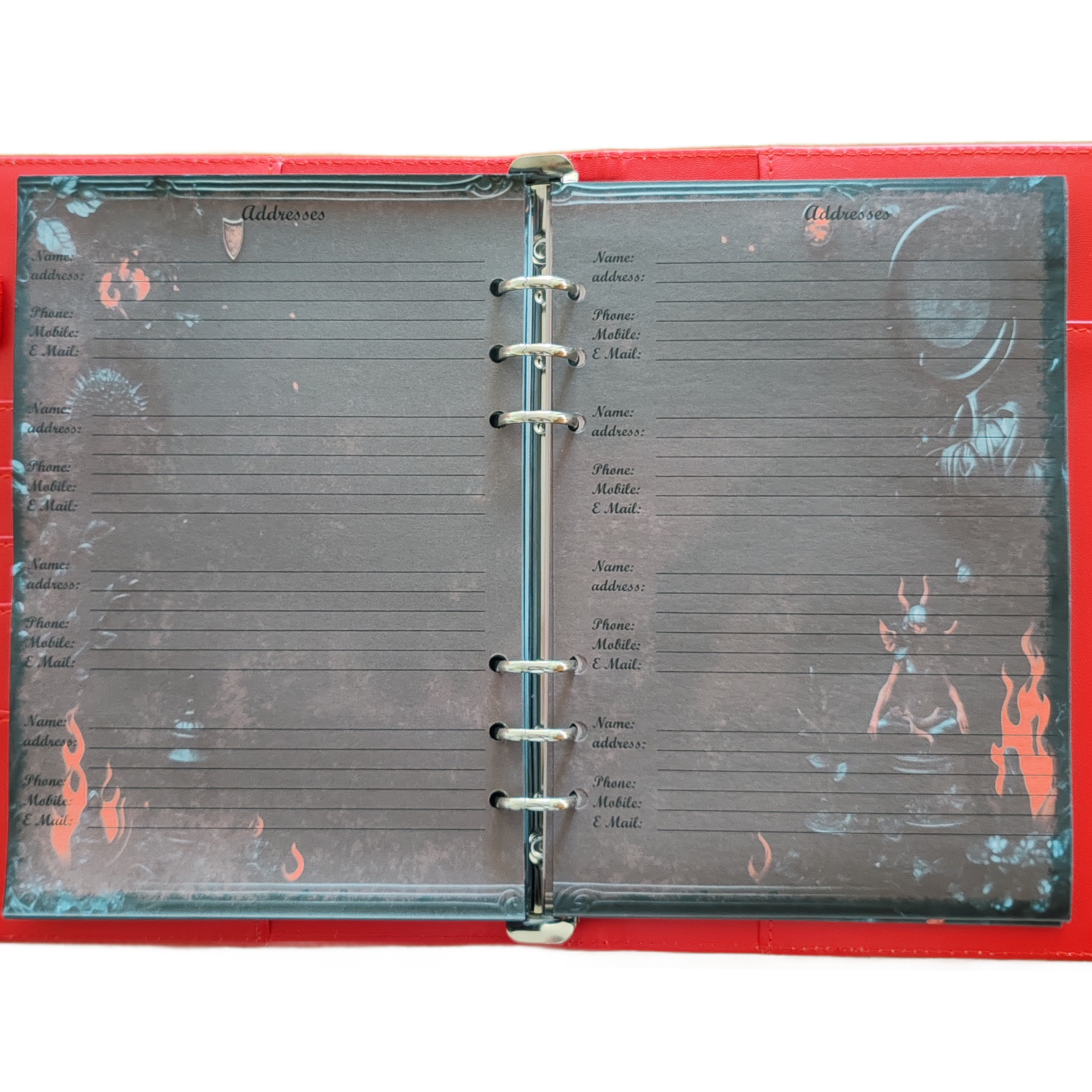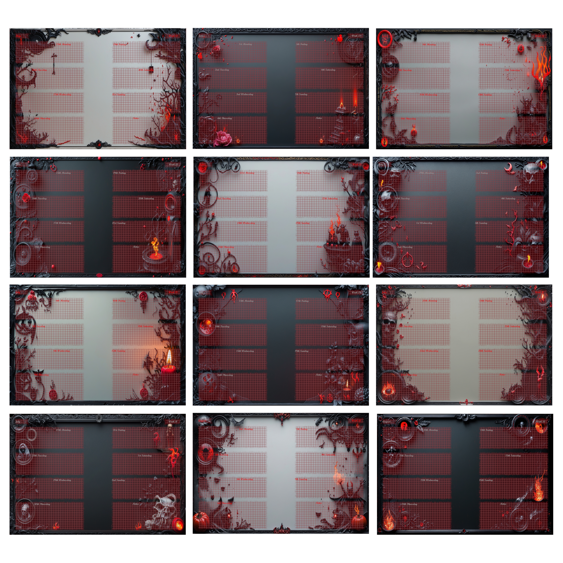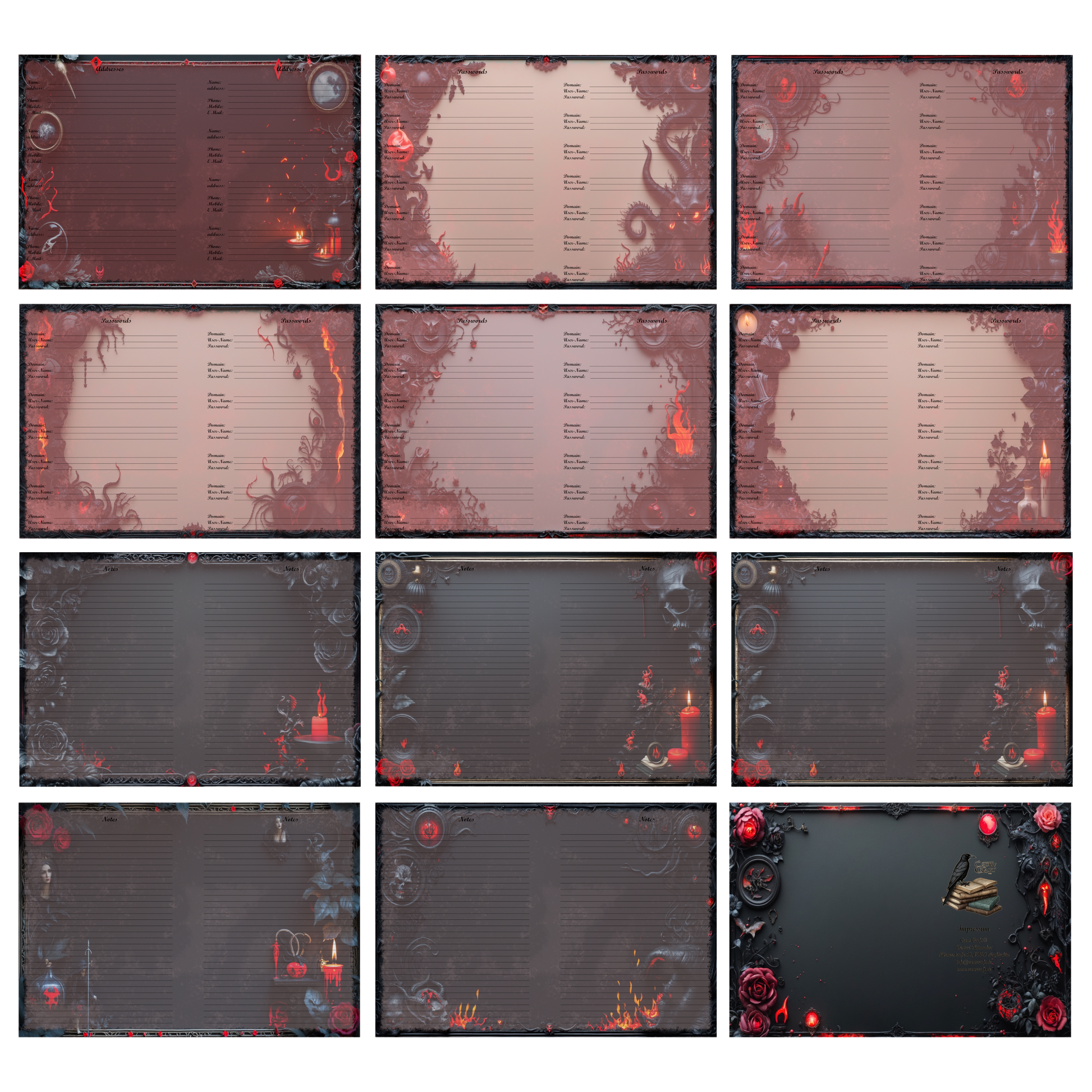Die schwarz-roten Motive – ein Spiel aus Asche, Rosen und mystischen Ornamenten – machen den „Ashes & Roses“ Kalender zu einem echten Eyecatcher. Ideal für alle, die einen ästhetisch düsteren Stil lieben.
