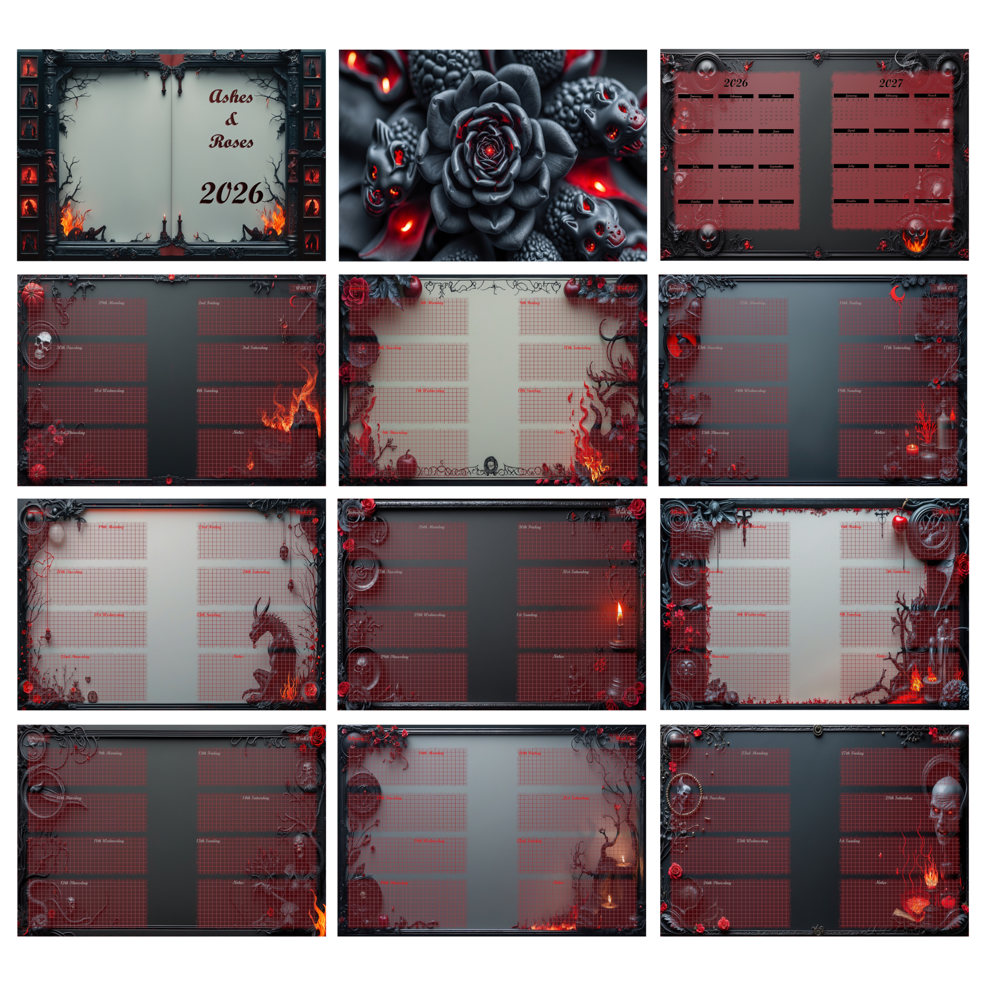 Betreten Sie das Jahr 2026 mit einem Hauch von Mystik und Eleganz. Der „Ashes & Roses“ Kalender entführt Sie in eine Welt aus tiefem Schwarz, blutroten Akzenten und okkult angehauchten Motiven, die jede Seite zu einem visuell fesselnden Erlebnis machen.
