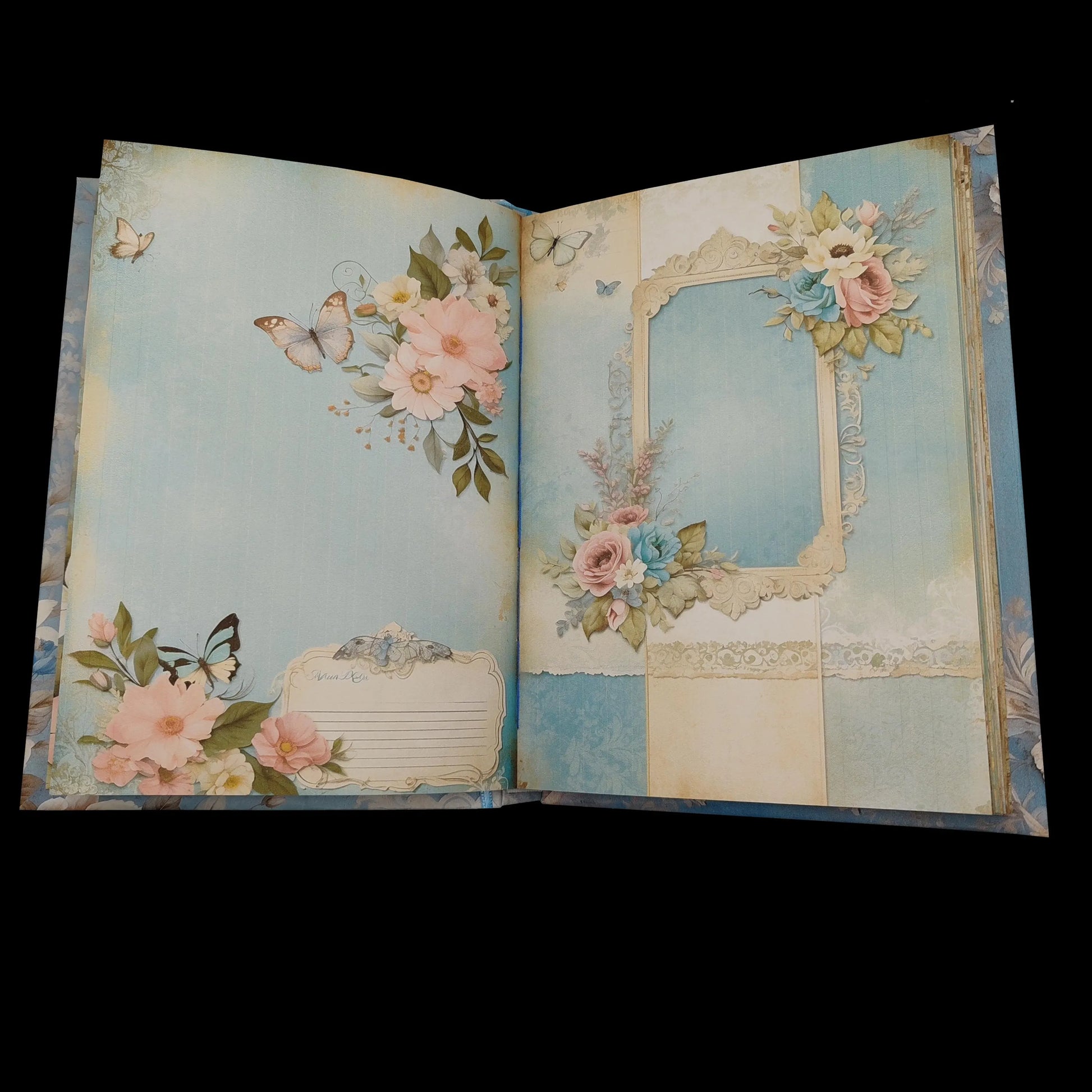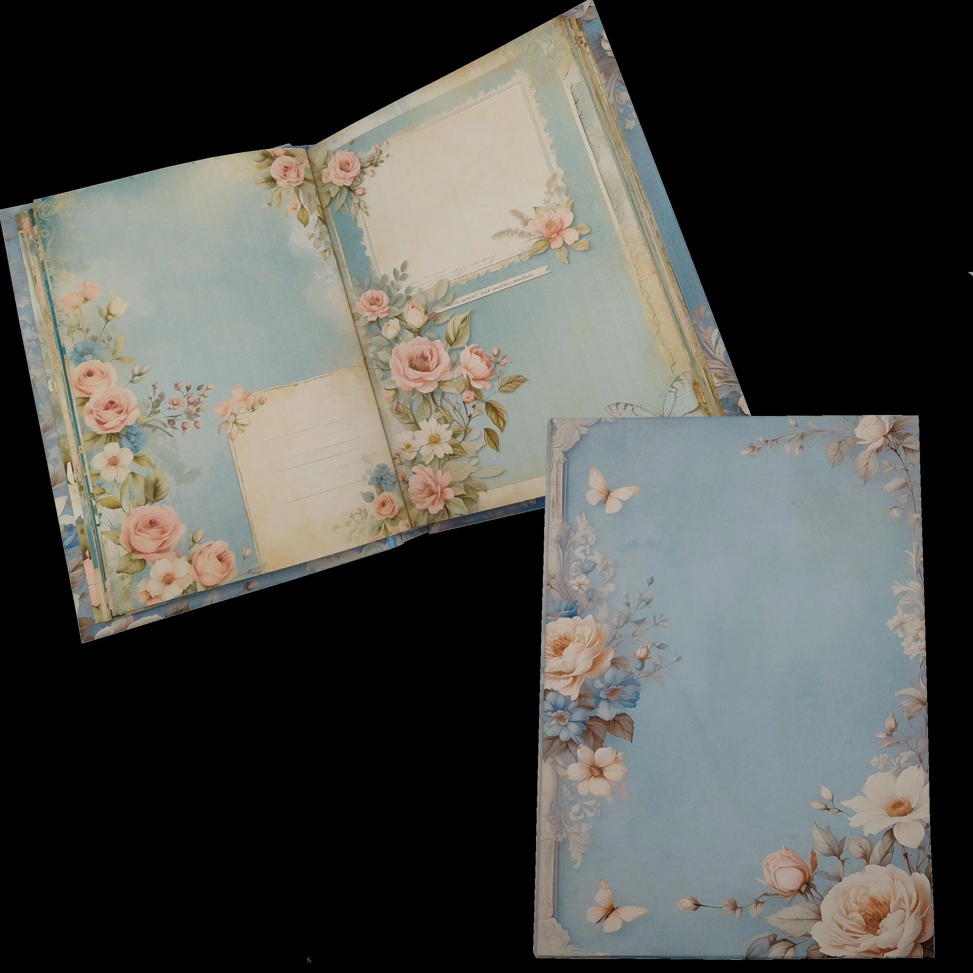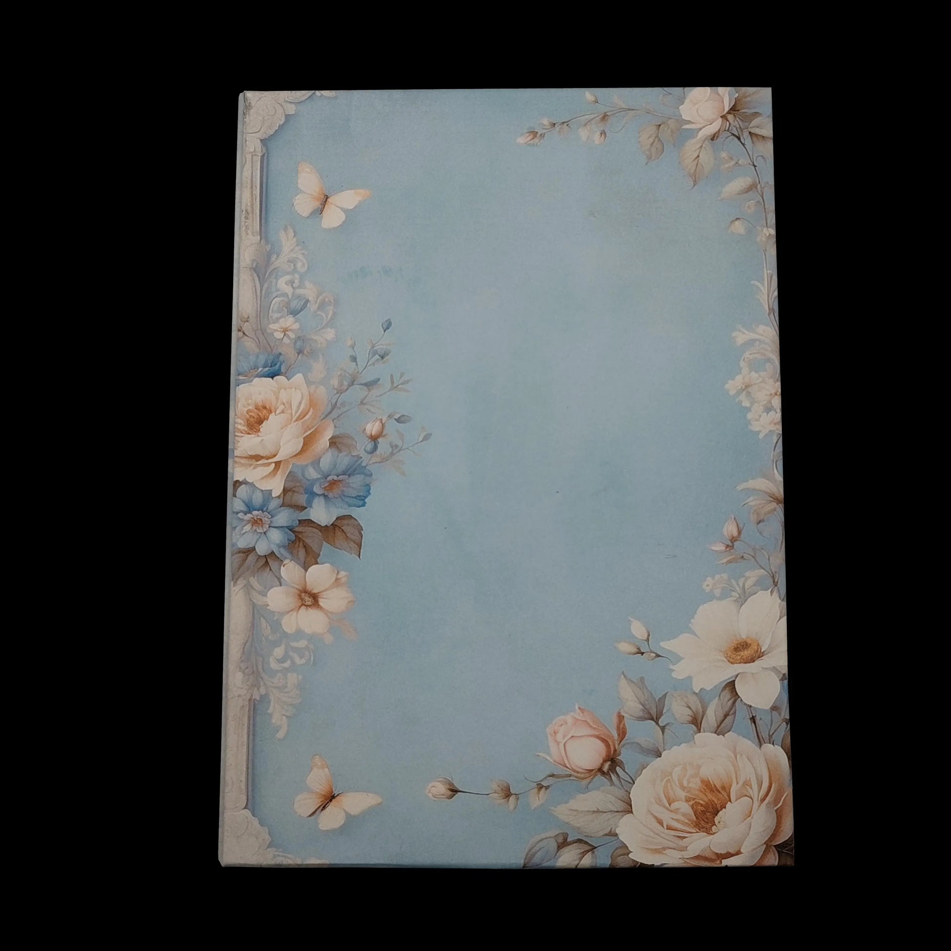 Auf einem pastellblauen Hintergrund entfalten sich wunderschöne, nostalgisch-elegante weiße Blüten und laden Sie ein, in eine Welt voller Ruhe und Inspiration einzutauchen. Dieses handgebundene Notizbuch ist nicht nur ein praktisches Schreibwerkzeug, sondern auch ein kunstvolles Kunstwerk, das die Seele berührt und die Sinne verzaubert.
