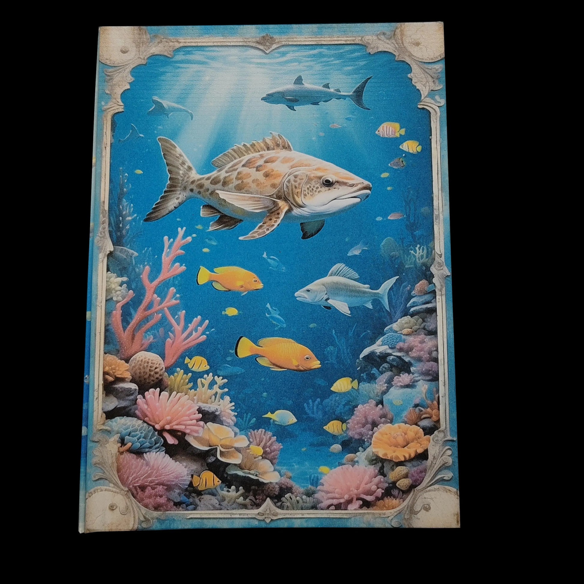 Tauchen Sie ein in eine lebendige und farbenfrohe Unterwasserlandschaft, die von einer Vielzahl von Meeresbewohnern und Pflanzen bevölkert wird. Dieses handgebundene Notizbuch lädt Sie ein, die geheimnisvolle Schönheit der Ozeane zu erkunden und Ihre eigenen Abenteuer festzuhalten.