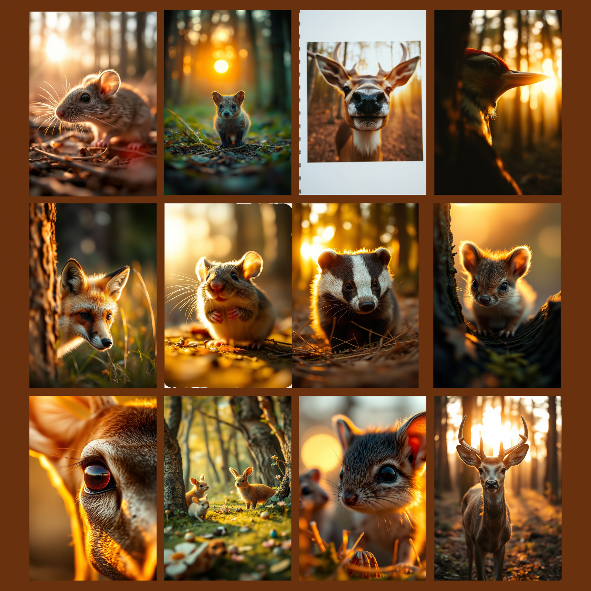 - Design: Eine Reihe von 100 einzigartigen Bildern, die Waldtiere in ihrem natürlichen Lebensraum fangen, von Rehen über Eichhörnchen bis zu Vögeln, alles im warmen Schein der Abendsonne.