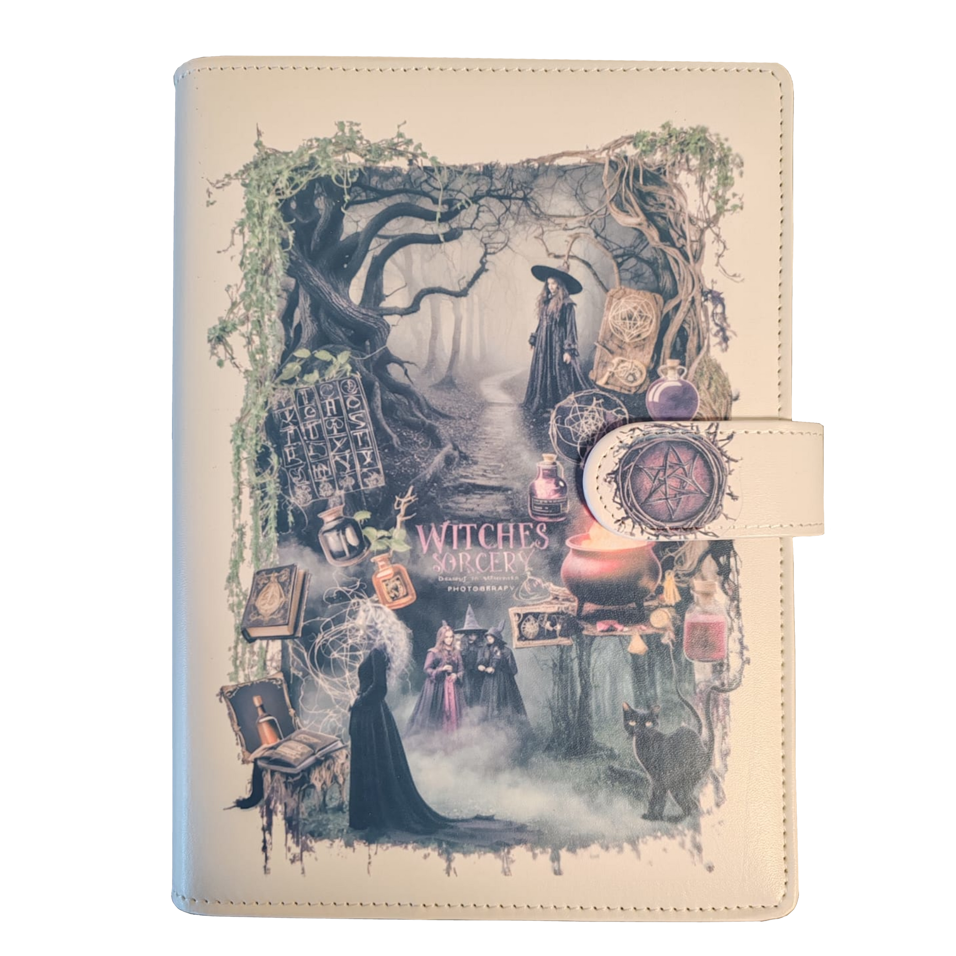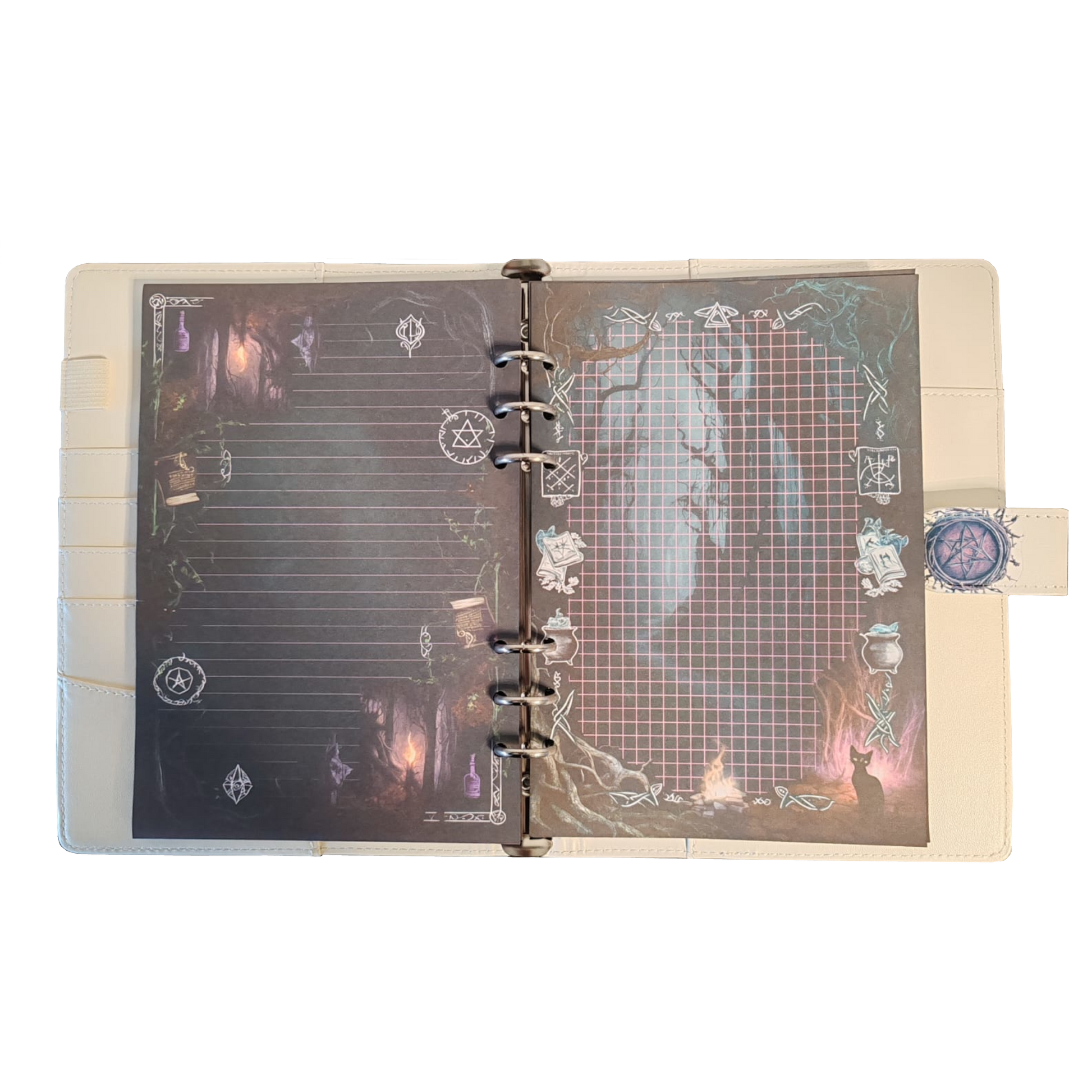 Das im Set enthaltene Ringbuch im DIN A5-Format ergänzt die Einlagen perfekt. Der Einband besticht durch seine Grundfarbe in elfenbeinweiß, die in Kontrast zu den dunklen Motiven der Einlagen steht und eine elegante, zugleich geheimnisvolle Ästhetik schafft. Das hochwertige Ringbuch bietet nicht nur Schutz, sondern ist langlebig und stilvoll, ideal für Ihre Notizen, Rituale oder kreativen Projekte. Dank des flexiblen Ringsystems lassen sich die Einlagen individuell sortieren und nach Ihren Wünschen neu arrangieren.